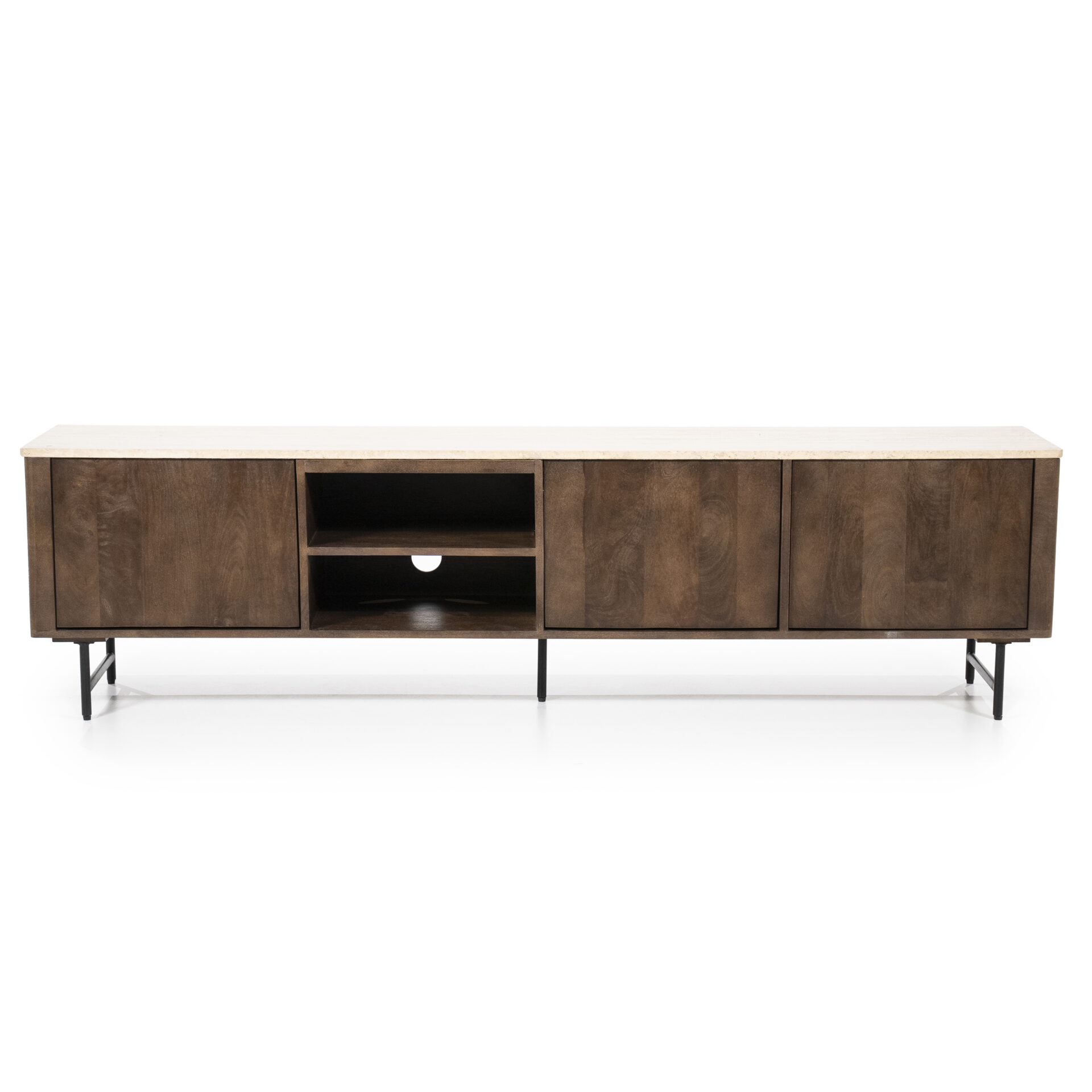 Tv-meubel Lio van Eleonora is gemaakt van mango hout. De kast heeft twee open vakken en drie deuren. Het blad boven de deuren is gemaakt van travertijn. Elk stuk is uniek, je haalt zo dus echt iets unieks in huis!