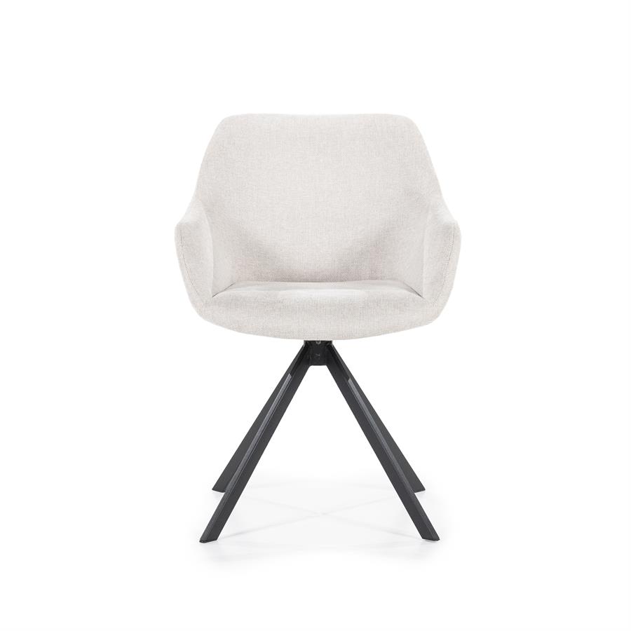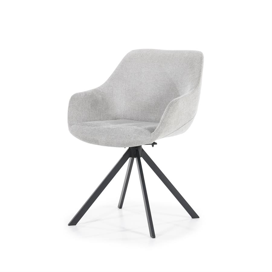 Eetkamerstoel Mamé is een mooie stoel met een goede zit. Deze stoel is 180 graden draaibaar en bekleed met een fijne stof. De armleuningen zorgen voor net dat extra comfort. Deze trendy stoel heeft een zwart, metalen spinpoot. De stoel is beschikbaar in de volgende kleuren: